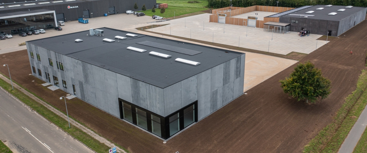 Til Amada har vi afleveret et nyt domicil, der indeholder kontor, montagehal og showroom. Ved projekteringen af bygningen har der været fokus på gennemsigtighed. Der er derfor etableret vinduer og glas brandpartier i både facader og indvendige vægge for at opnå en naturlig sammenhæng mellem funktionerne i huset.