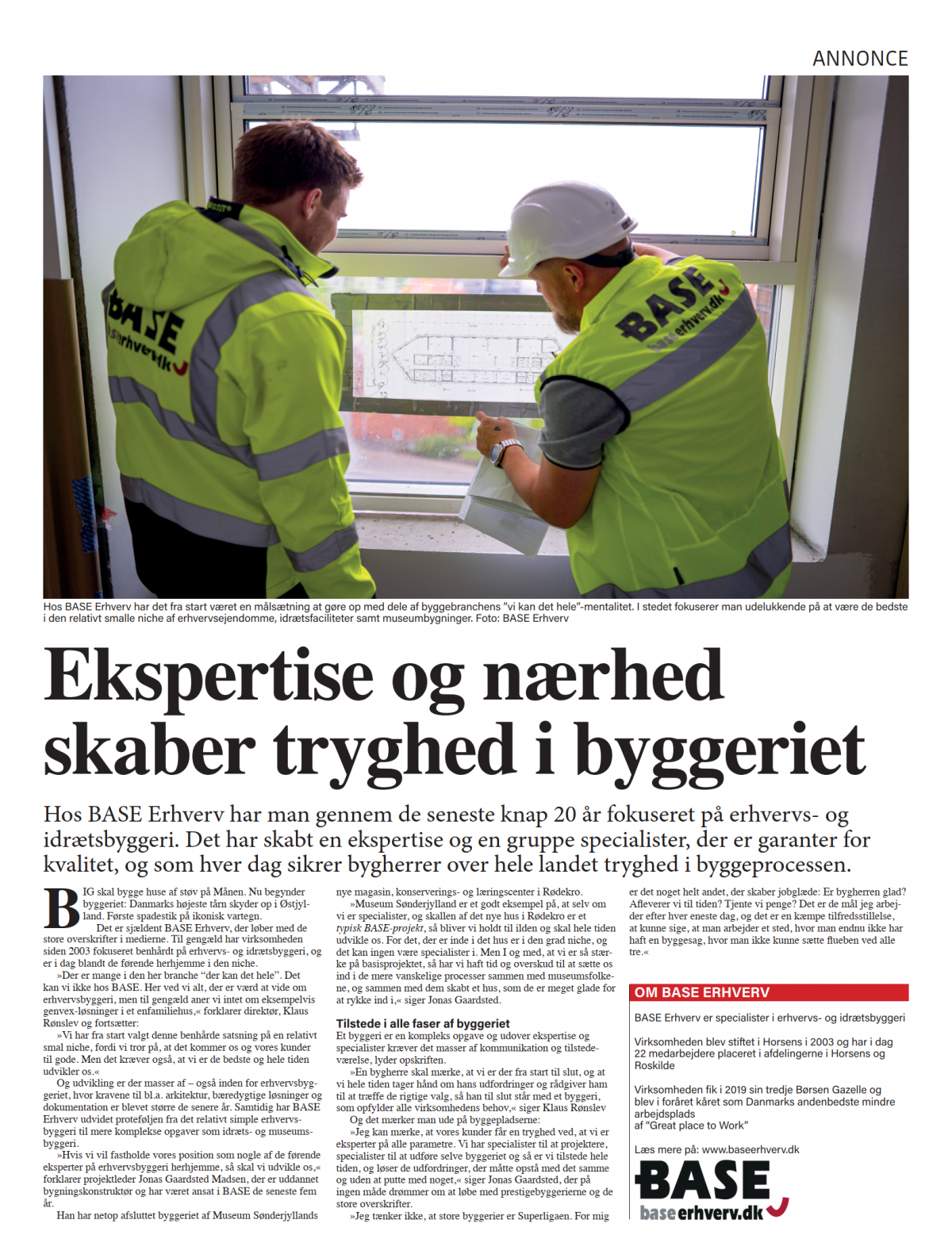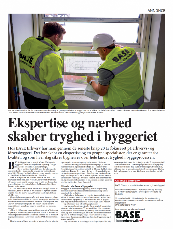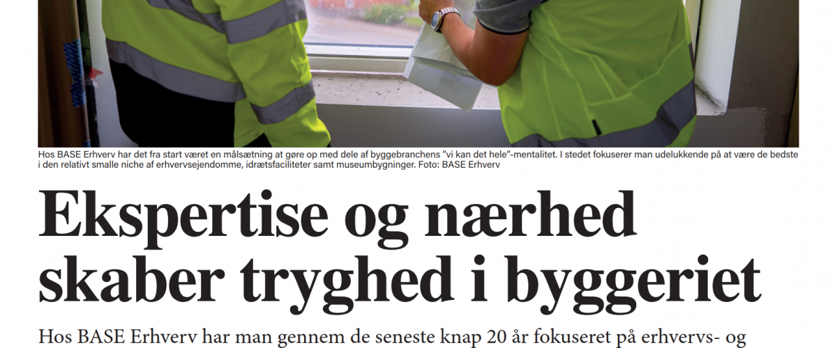 »Der er mange i den her branche “der kan det hele”. Det kan vi ikke hos BASE. Her ved vi alt, der er værd at vide om erhvervsbyggeri, men til gengæld aner vi intet om eksempelvis genvex-løsninger i et enfamiliehus,« forklarer direktør, Klaus Rønslev og fortsætter: