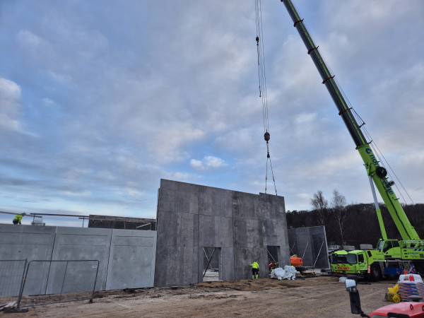 På den nye idrætshal ved Frederiksværk Skole er vi nået til endnu en vigtig fase, hvor elementmontagen netop er i gang. Elementerne leveres af Heidelberg Materials Precast Denmark A/S, mens dan-con elementmontage ApS står for montagen.