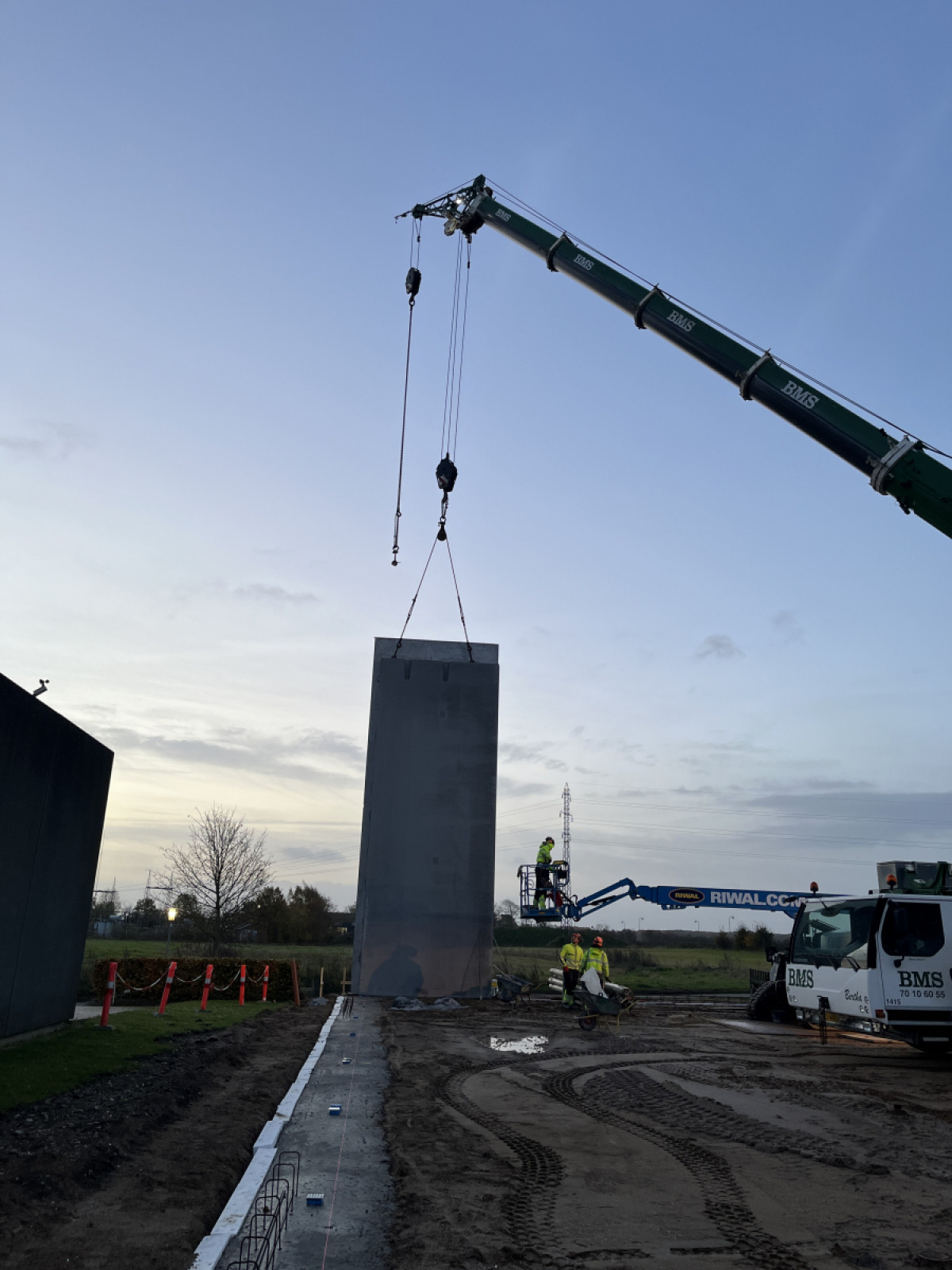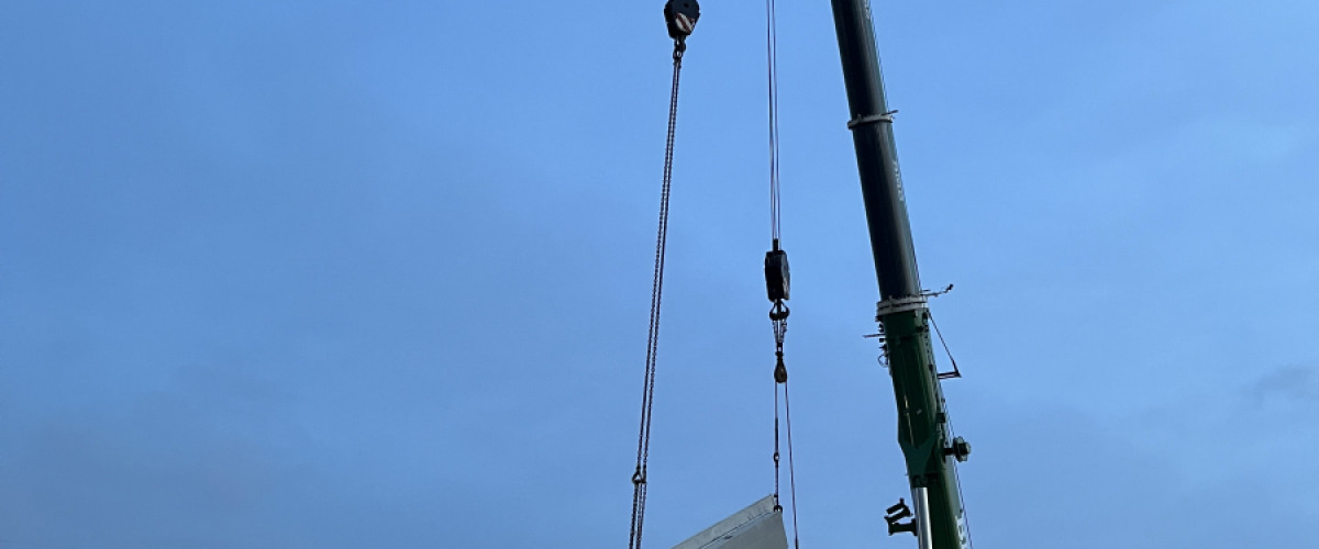 I morges startede vi elementmontagen på CK Johansen-projektet i Horsens, hvor BASE Erhverv opfører en ny lagerhal. Med 52 sandwichelementer og 10 tagplader udgør elementerne i alt 1.173 ton.