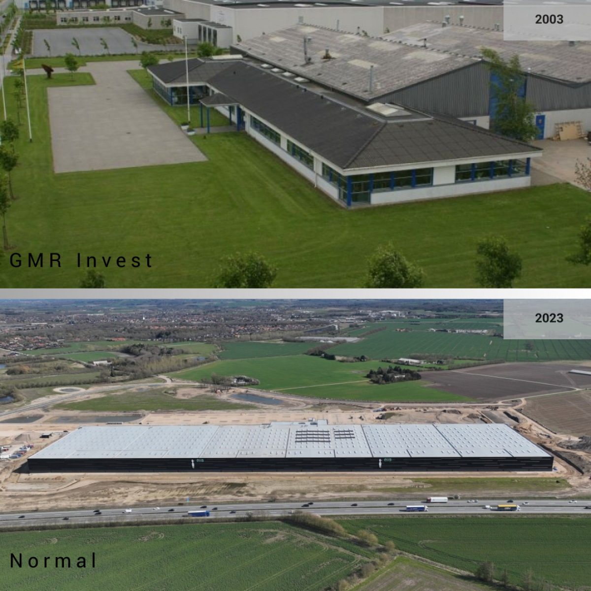 Tyve år er nu gået, og vi kan med stolthed sige, at vi har været med til at opføre 410.336 m2 idræts- og erhvervsbyggeri i Danmark. Senest har vi opført ikke mindre end 78.000 m2 logistikpark for Normal i Hedensted, hvilket til dags dato er det største byggeri, vi har opført. Størrelsesforskellen mellem GMR Invest og Normal er til at få øje på!