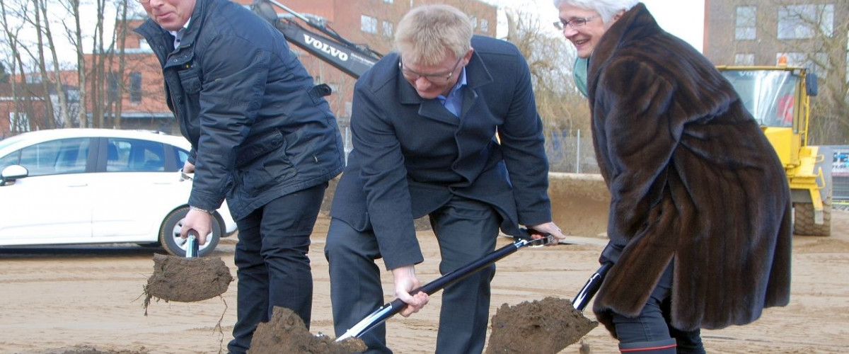 -Vi er ved at få lavet salgsmaterialet nu, og ejerboligerne bliver om kort tid udbudt til salg, sagde adm. dir., CEO Anton Nørgaard, Dansk Boligbyg a/s inden han sammen med NRGi´s bestyrelsesformand og borgmesteren tog det første spadestik på 1. etape af projektet, hvor der endnu ikke er sat en startdato på 2. etape hen mod Adventskirken på hjørnet af Lichtenbergsgade og Bygholm Parkvej.