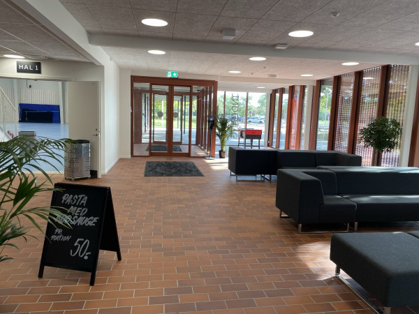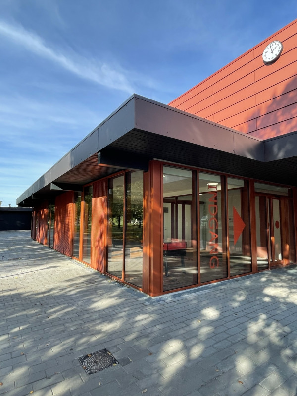 Det eksisterende halkompleks er opført i røde teglsten forbundet af gangarealer med glaspartier. Den nye multihal indpasses i omgivelserne med dens beklædning af rødlige fibercementplader monteret på klink. Foyeren, som kobles til de eksisterende gangarealer, opføres i glas-partier med rødlige profiler, hvilket skaber udkig til de udendørs grønne og beplantede arealer.