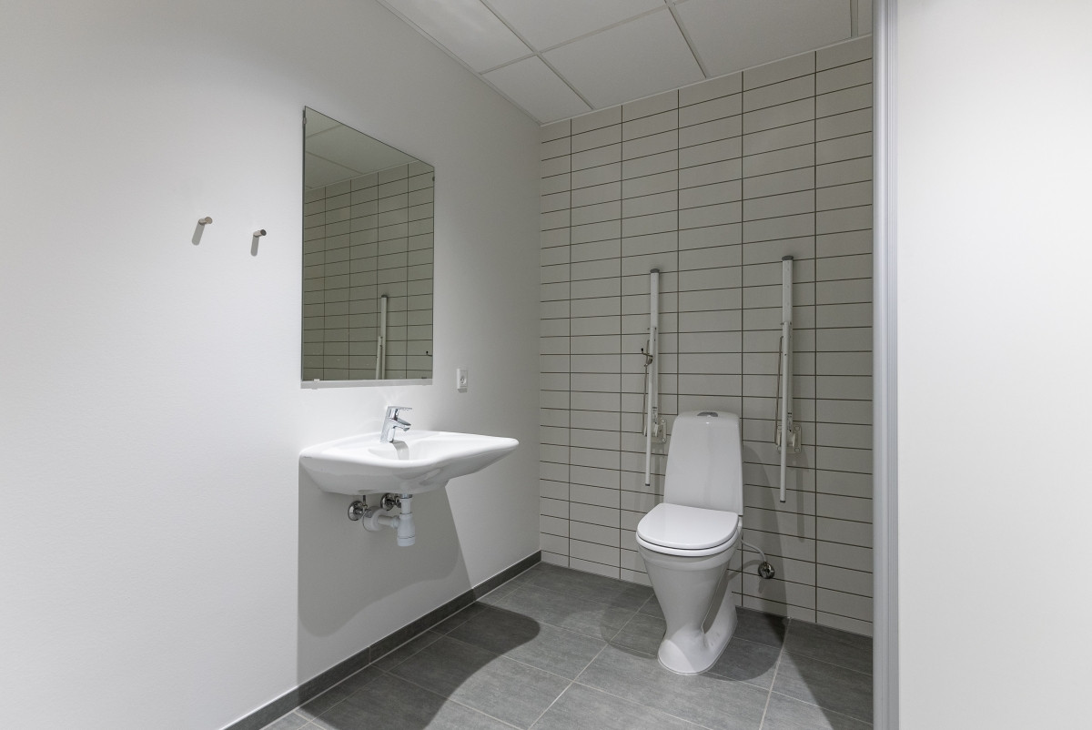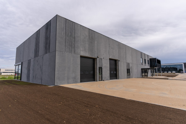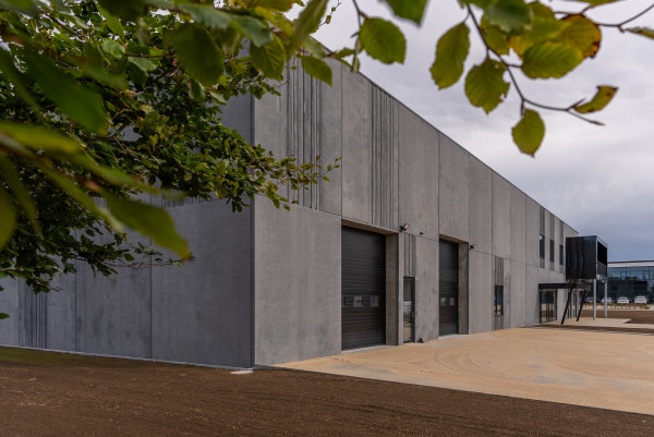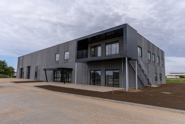 Domicilet er opført i glatte mørkegrå sandwich-betonelementer med indbyggede felter, der har struktur som bræddeforskalling.