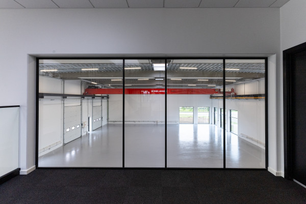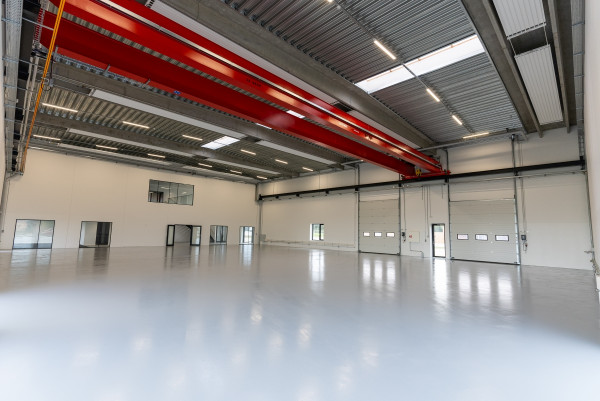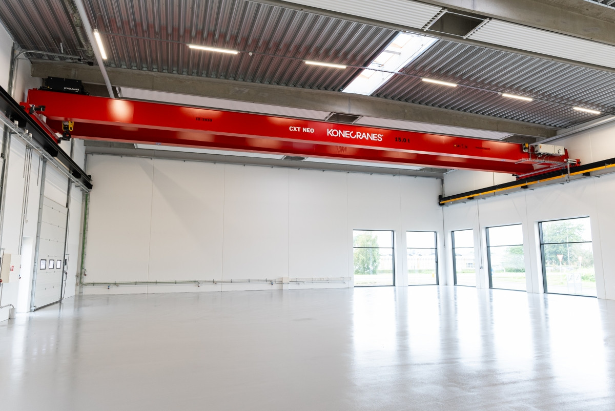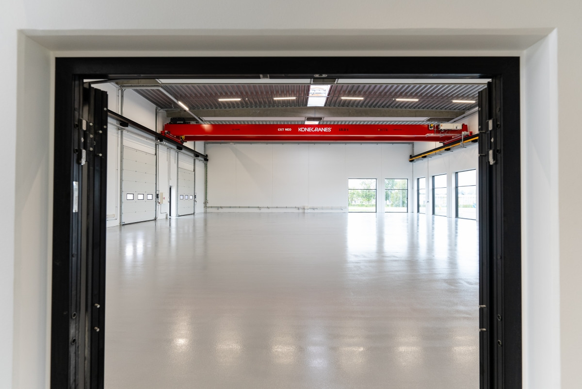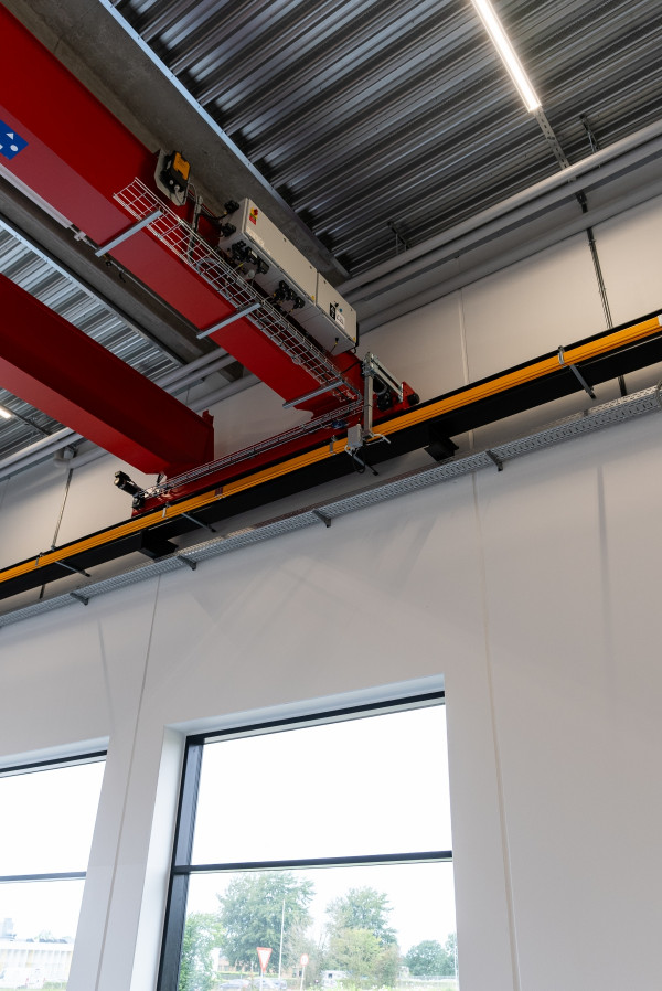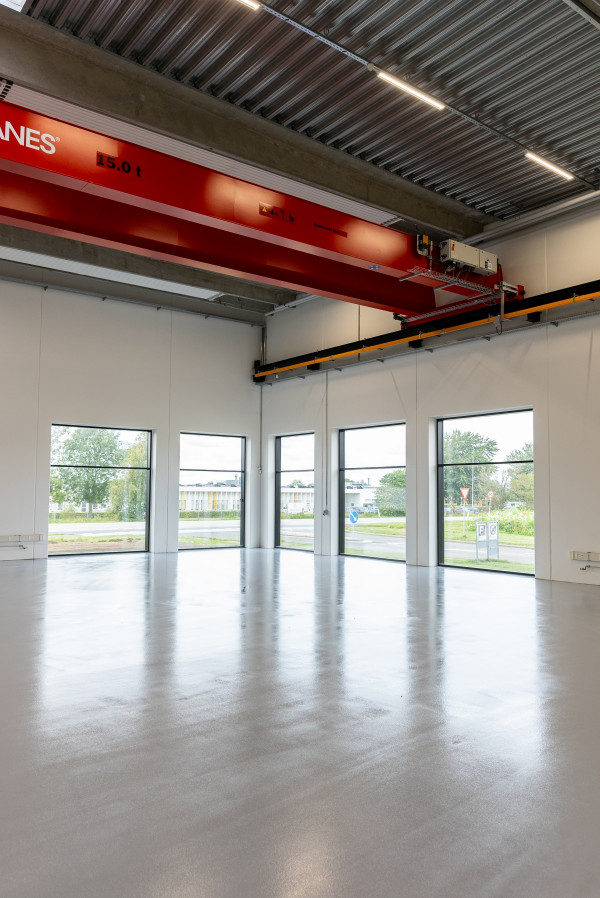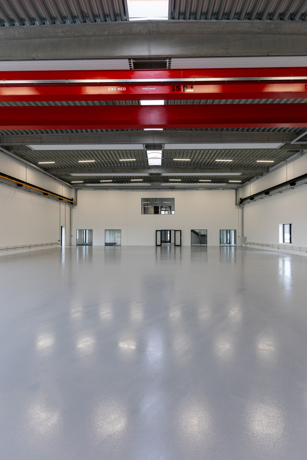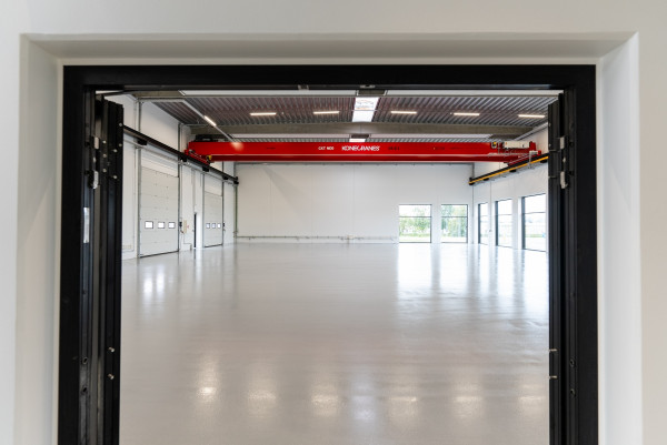 I hallen er der en frihøjde på 7,6 meter under TTS tagelementer og der monteres traverskran med en bæreevne på 10 tons.