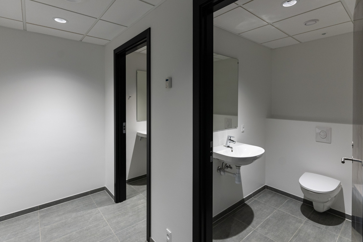 Til modsatte side af midterpartiet er der adgang til show- og montagehallen, der er udført med malede vægge og epoxy belægning på gulve.