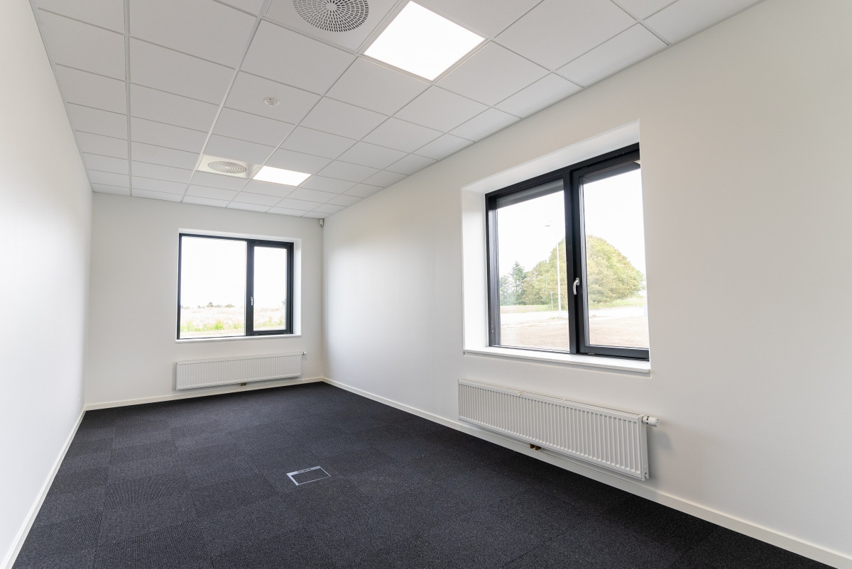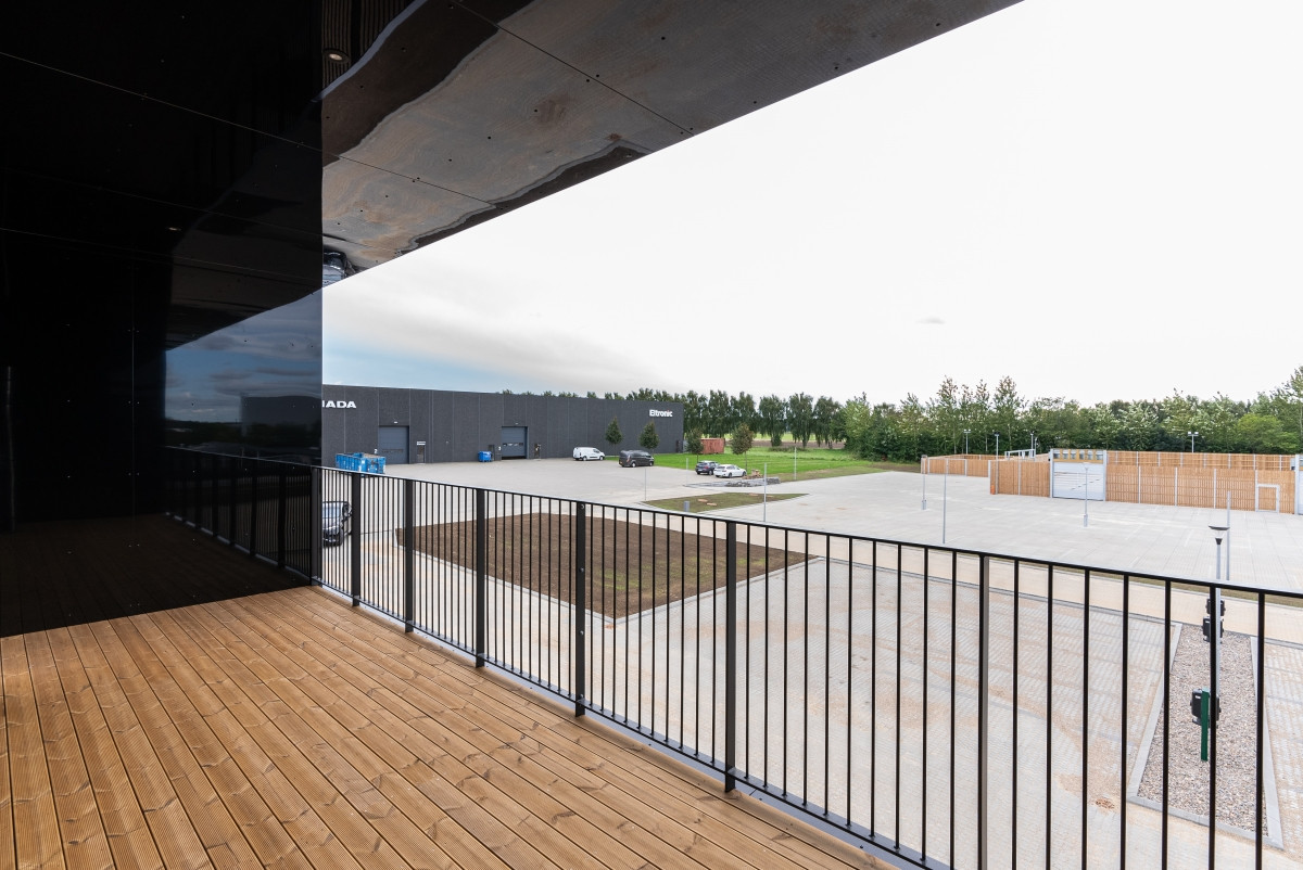 I forbindelse med kontordelen er der etableret en overdækket terrasse med overhængende balkon.