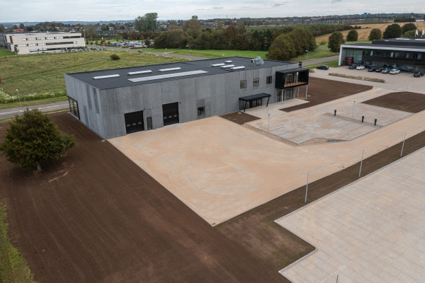 Udenomsarealer, på ca. 1.800 m2, er etableret med adskilt tung trafik til hallen og let trafik til parkeringsforhold og adgang til administrationsdelen.
