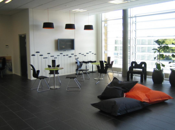 En stor del af de indvendige vægge er udført som glasskillevægge for at opnå åbenhed og lyse lokaler.