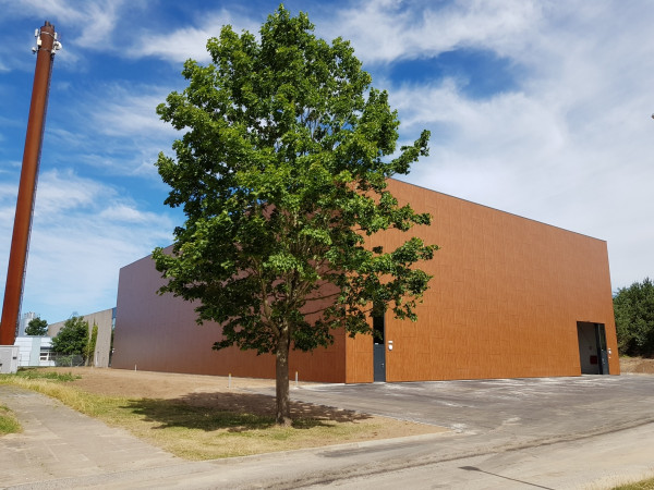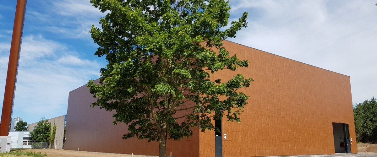 Udvendigt er bygningen beklædt med facadeplader, der er opbygget på en klimaskærm af sandwichpaneler.