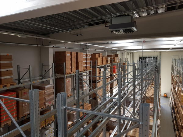 Bygningen er udført som højlager på 14 meter med indvendigt reolsystem og reolsprinkling.
