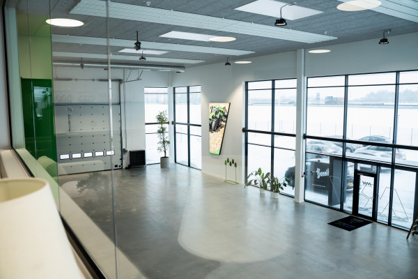 I domicilet udføres glasvægge ved kontorer, møderum og salgskontor, så der skabes gennemsigtighed mellem administration og showroom. Showroomet er en central del af byggeriet og udstyres med et stort glasparti, der vender ud mod motorvejen. Facaderne opføres i betonsandwichelementer i glat grå, iblandet hvid cement for en lysere farve.