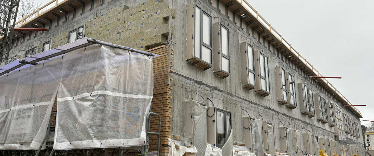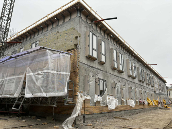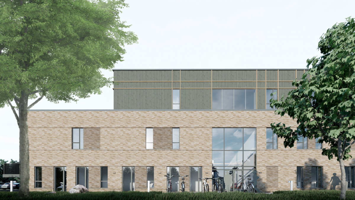 Bygningen opføres i stueetagen og 1. sal med betonelementer, mens 2. salen opføres i lette trækonstruktioner. Facaderne skalmures med en kombination af genbrugs- og nye mursten, og facaden på 2. sal beklædes med bæredygtige facadeplader.