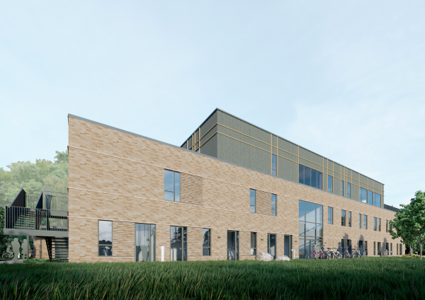 Den nye bygning opføres i naturlig sammenhæng med de eksisterende bygninger og tilpasses de omkringliggende udearealer.