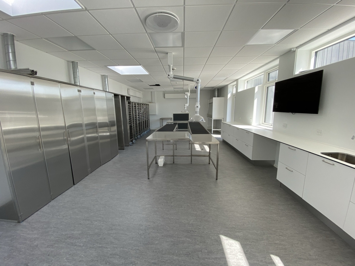 Omklædning, toiletter, bruserum, fjernarkiv, grovlaboratorie, mellemlaboratorie, kalk- og finlaboratorie.