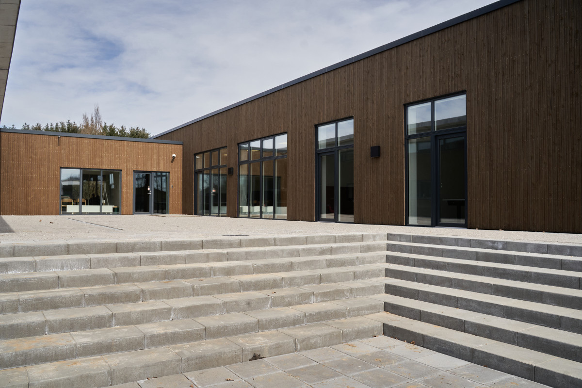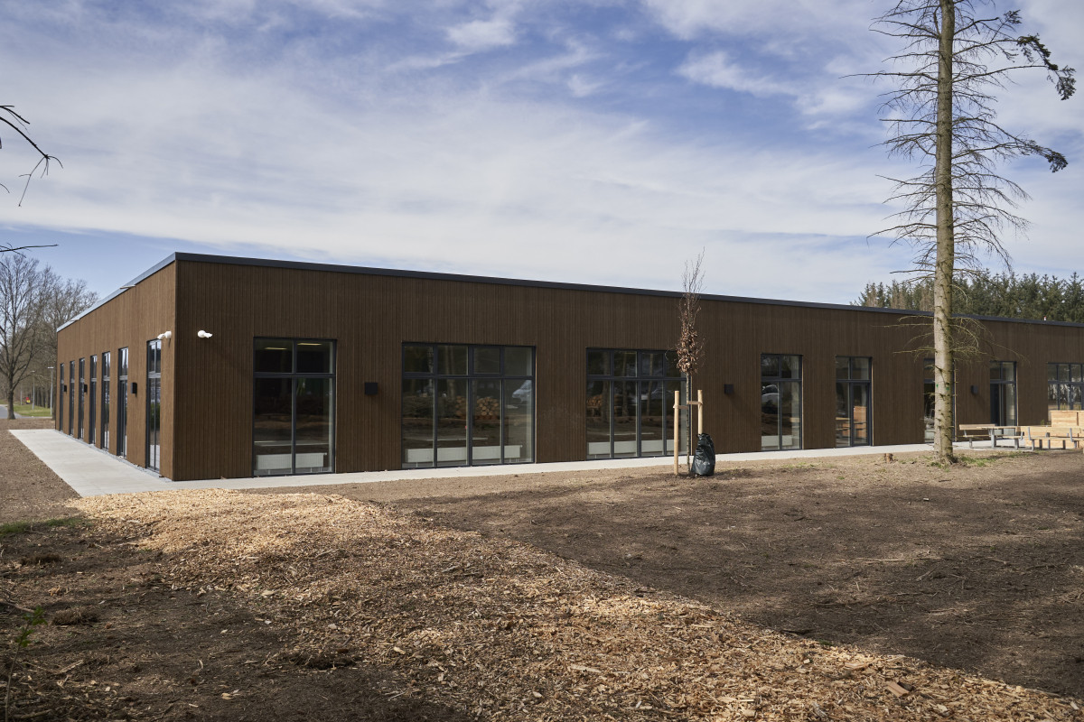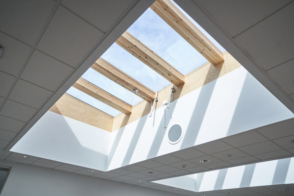 Med et målrettet fokus på brugen af træ i byggeriet er tilbygningen blivet opført i præfabrikeret træelementer for både facade- og tagelementer, hvor tagfladen er med tagpap.