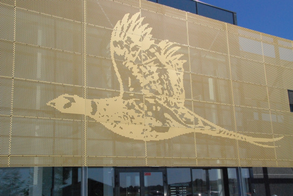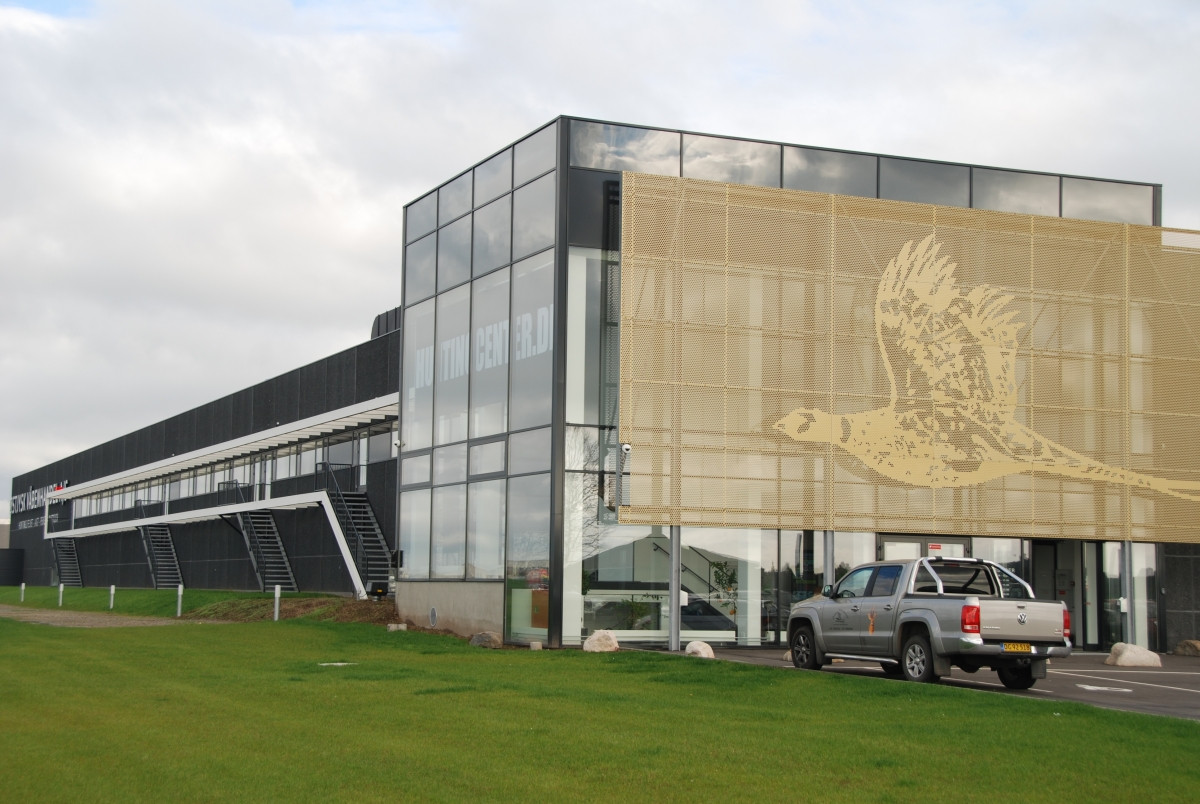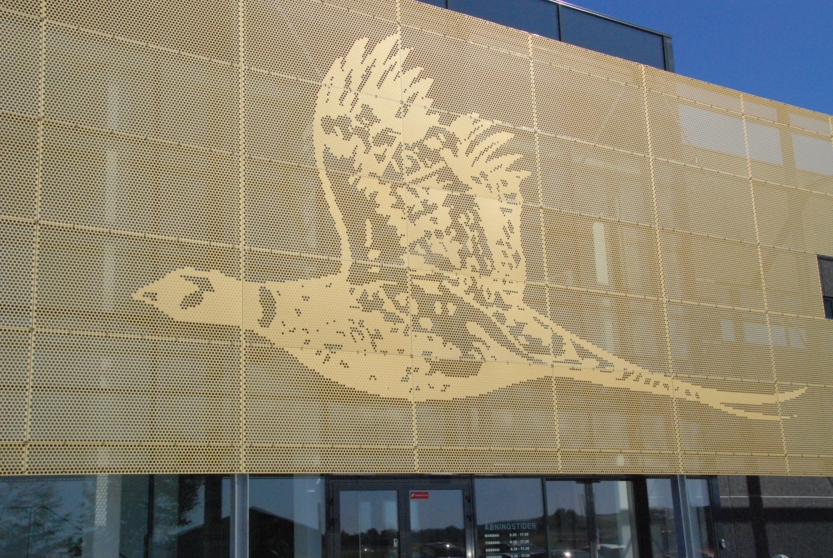 Erhvervsbyggeriet er udført i mørke betonelementer med lange vandrette vinduesbånd og store glaspartier fra gulv til loft. Logo-grafik af en flyvende fasan er et dekorativt element på en markant solskærm foran indgangsfacaden, som vil få en ikonisk værdi for bygningen og dens indhold - og bliver et pejlemærke for forretningens kunder og forbipasserende på E45.