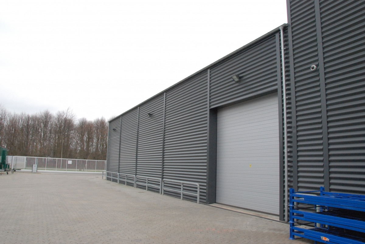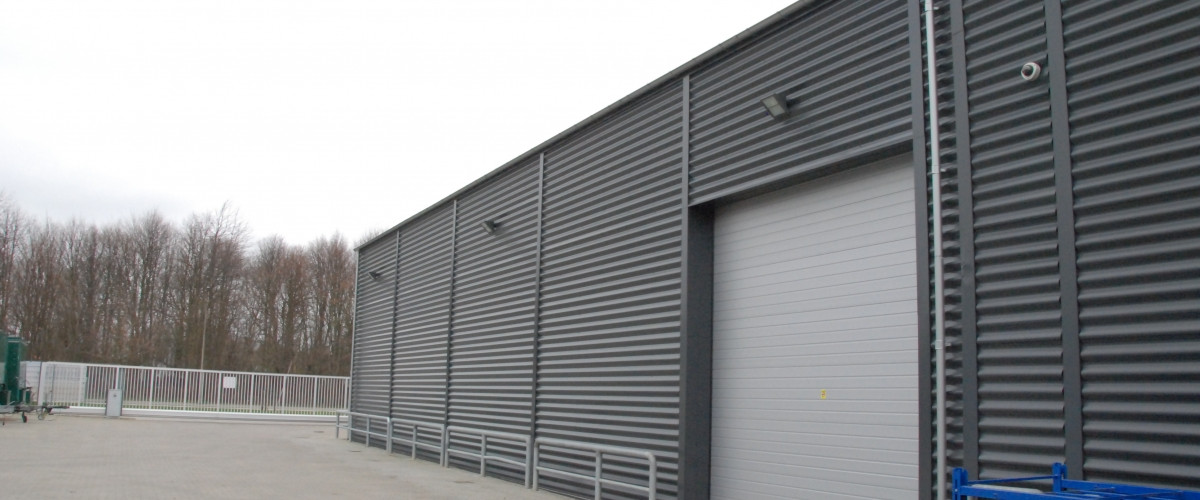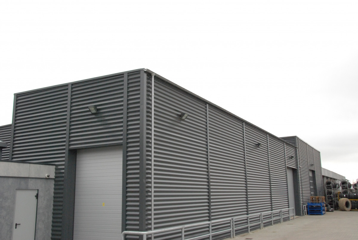 Erhvervsbygningen er udført i betonelementer, beklædt med sinusplader, der matcher den øvrige bygningsmasse.